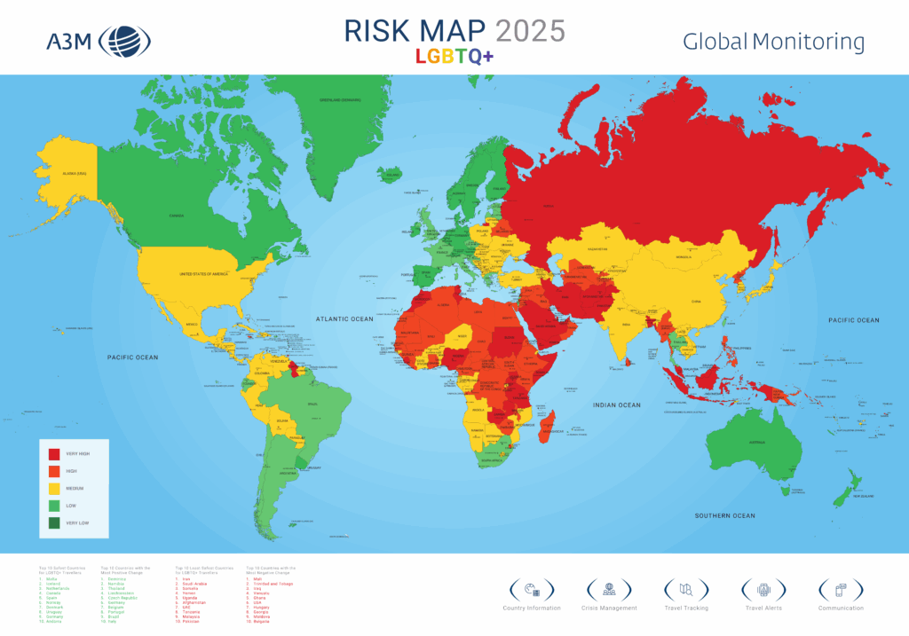 Compiled by A3M Global Monitoring, a provider of travel risk assessment tools, and developed in collaboration with Diversity Tourism and ITB Berlin, the map highlights both legal frameworks and lived experiences of queer travellers across the world.