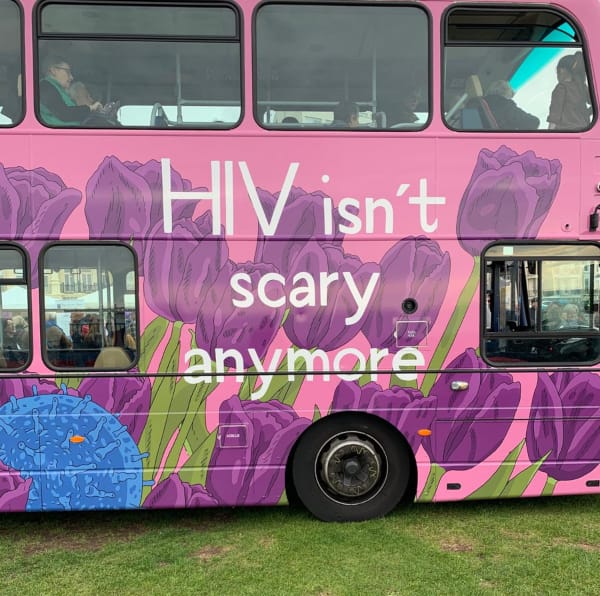 The bus is covered with purple Queen of the Night tulips, Martin’s favourite flower, while panels inside the bus give people the facts around HIV and aim to reduce the stigma and misinformation around the virus. They also talk about Martin’s life and work and recent advances in HIV treatment.