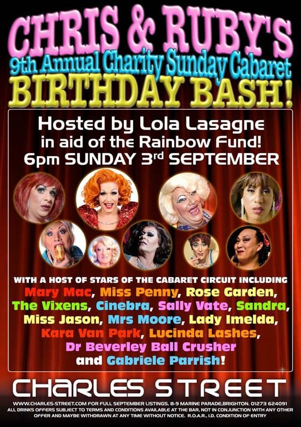 Chris Marshall, manager at Charles Street and DJ extraordinaire Ruby Roo celebrate their respective birthdays on Sunday, September 3 with a fundraise extravaganza at Charles Street to benefit the Rainbow Fund. Hosted by the Lola Lasagne, artists appearing will include such luminaries of the cabaret