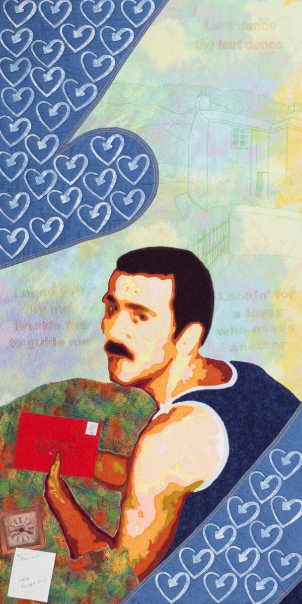 Rupert Whitaker OBE, co-founder of Terrence Higgins Trust, worked with quilter Paula Doyle on a panel with his tribute to Terry. He said: “This panel contains images of some of the most meaningful things connected with Terry: my favourite photo of him, his letters to me at uni, some song titles we used to dance to in Heaven, the clock he gave me for Christmas and the note he put in the back of it (which always makes me smile), my grandmother’s cottage in Boscastle where we stayed in the autumn and made crumble from freshly picked blackberries, and where, the following summer, I scattered his ashes in the Valency river nearby. It contains a sad, but beautiful, set of memories that bring him right back to me. I’m so grateful for the kindness and artistry of Paula, the quilter.”