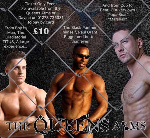 Davina Sparkle hosts a fun, raunchy, sex show with three of her gorgeous hunks doing the full monty in the intimate surrounds of the Queens Arms. A brilliant fun show, raunchy and very sexy with three of the largest strippers in the biz; Papa Bear Marshall, top Stripper TITUS (Gladiator) Rowe, and B