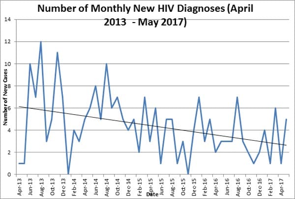 While they report much variation in local figures from month to month, over the last four years Brighton has in fact seen a decline from an average of six new diagnoses per month just over four years ago to around three per month by May of this year. The figures have only just been analysed and clinicians are in the process of performing further analyses in order to understand more about the reasons for the decline.