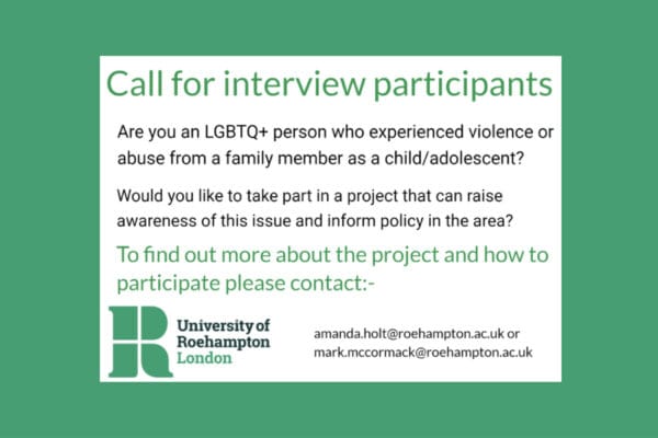 “University of Roehampton is seeking to interview LGBTQ+ people who have experienced some form of abuse or violence from one or more family members while growing up.”