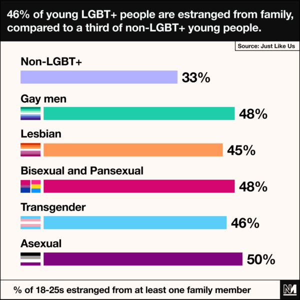 Almost half of LGBTQ+ young adults (46%) are estranged from at least one family member and a third (31%) are ‘not confident’ that their parent/guardian will accept them, according to new research by LGBTQ+ young people’s charity, Just Like Us.