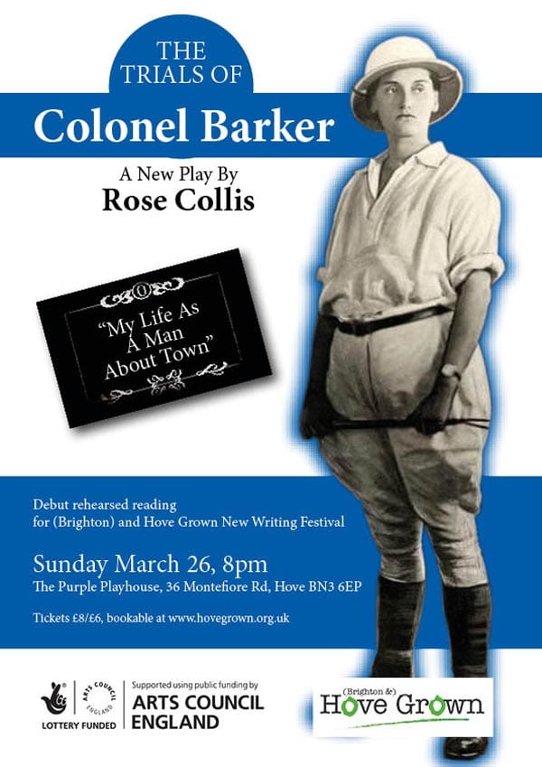The Trials of Colonel Barker, a new full-length stage play by Rose Collis, funded by Arts Council England and based on her book Colonel Barker’s Monstrous Regiment, makes its world premiere with a one-off rehearsed reading as part of the second (Brighton and) Hove Grown Festival.