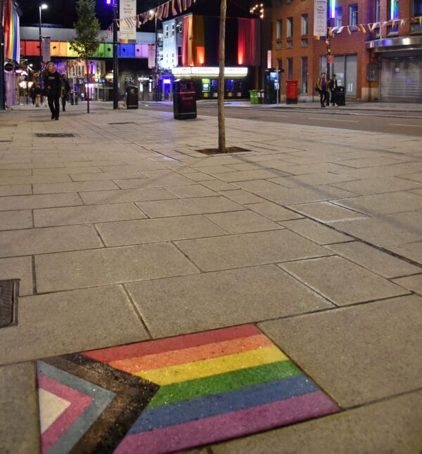 Sixteen paving slabs were laid in February 2022 which feature the Pride Progress flag. This flag represents the diversity of the LGBT+ community with the design including the six coloured stripes of the original rainbow flag of the LGBT+ community. To this, it adds five coloured stripes in the shape of an arrow, which represent trans and non-binary people, marginalised people of colour in the LGBTQ+ community, and people living with HIV/AIDS.