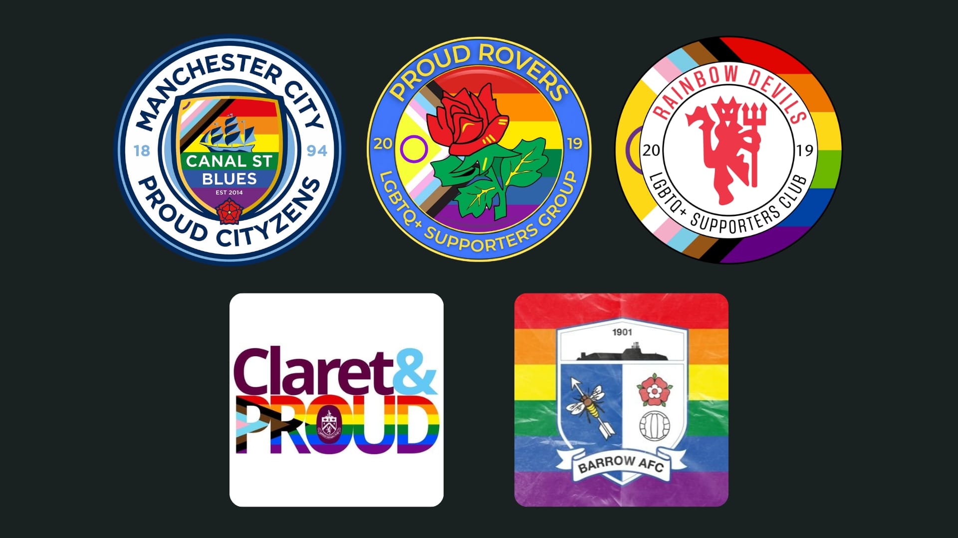 The founding members of the alliance include Canal Street Blues (Manchester City), Claret & Proud (Burnley FC), Rainbow Devils (Manchester United), Proud Rovers (Blackburn Rovers) and Proud Bluebirds (Barrow AFC).