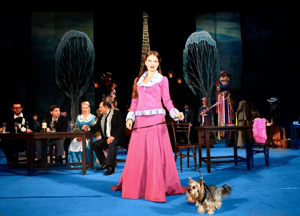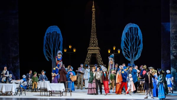 This is an utterly charming performance, with some of Kent’s signature touches, a stage filling spectacle; here a busy winter market scene, filled with bubble blowers, stilt-walkers, huge puppets and a mass of Parisienne costumed chorus members all milling about with wintery glee. We had a doggy troop on alongside Muzetta’s entrance, both delighted a very appreciative audience and a quite a lot of younger local people, mop capped, who made up the children of this diverse Parisian arrondissement.