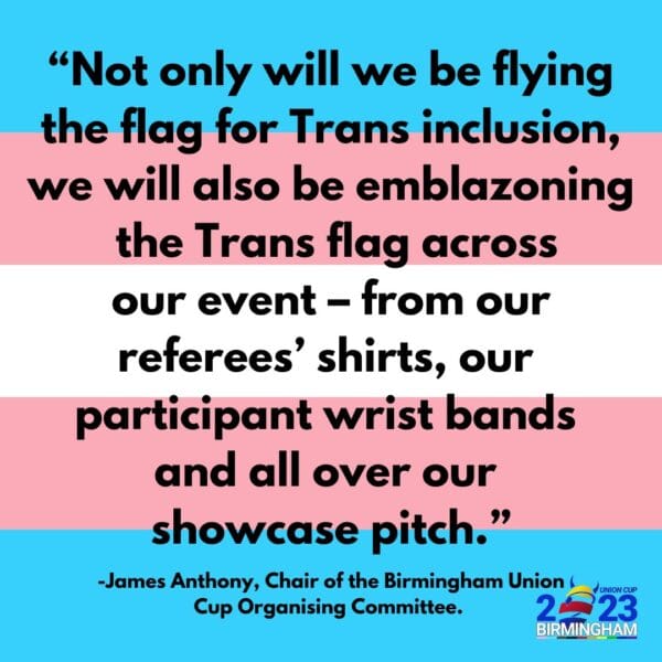 James Anthony, Chair of the Birmingham Union Cup Organising Committee, added: “Not only will we be flying the flag for trans inclusion, we will be emblazing the trans across our event, from our referees’ shirts, our participant wrist bands and all over our showcase pitch.”