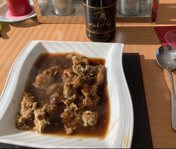 Leave 6 large slices of bread out overnight to go dry – you can also use bread rolls or muffins. The following day boil 2 medium onions till soft – I add mixed herbs and white pepper to the liquid. Set aside to cool.