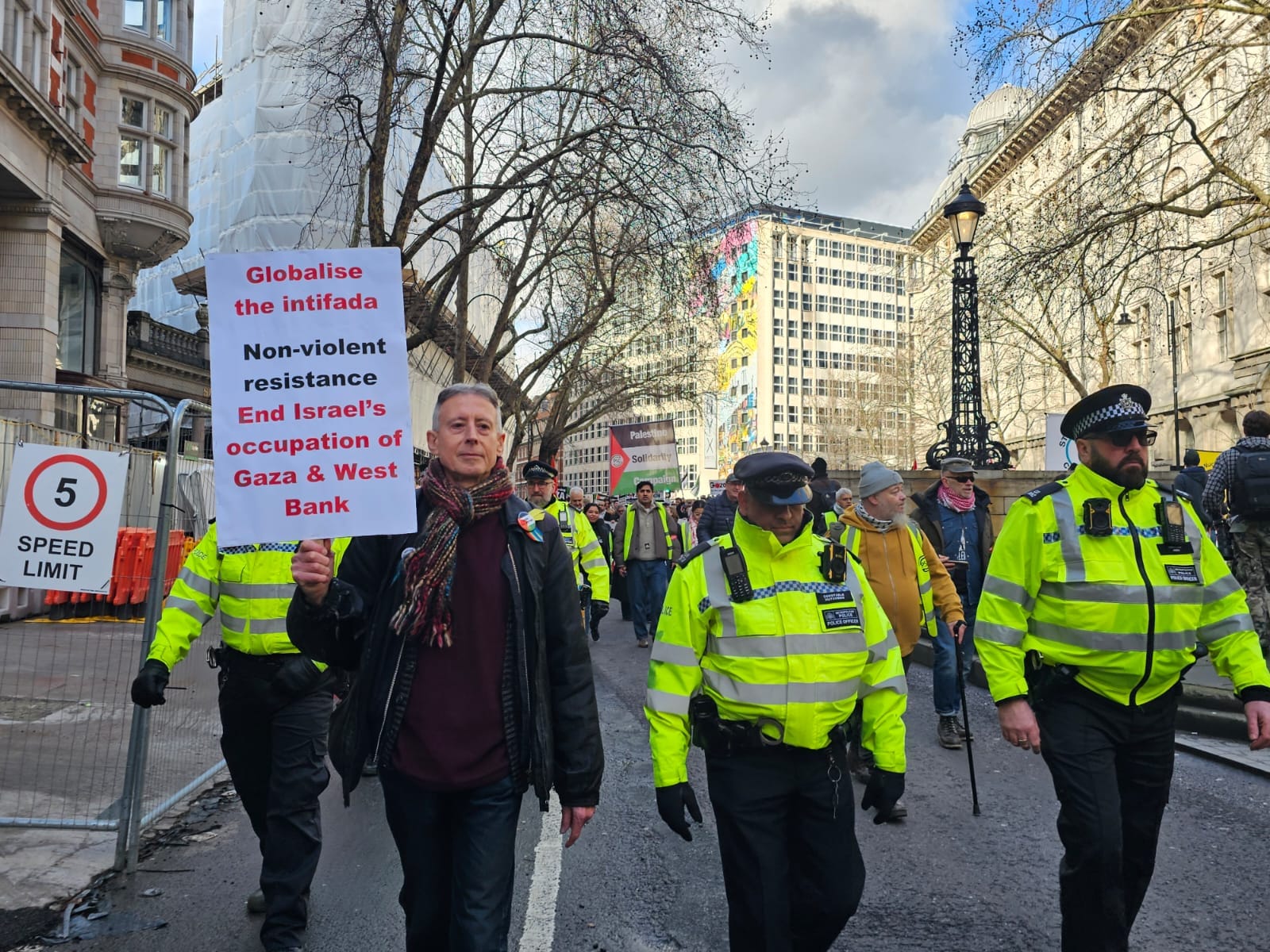 Tatchell’s sign read: “Globalise the intifada: Non-violent resistance. End Israel’s occupation of Gaza & West Bank”. He was detained on the Strand and taken to Sutton Police Station.