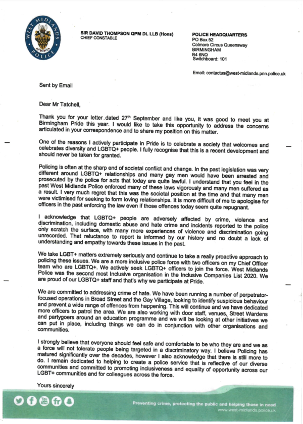 Peter Tatchell wrote to Sir David Thompson requesting him to apologise: It is “time that you apologised for the past persecution of LGBT+ people by West Midlands Police. Your force was one of the most homophobic in Britain. While you are not responsible for past wrongs, you are head of the force that witch-hunted us. I hope you will draw a line under that persecution by making an apology, so we can move forward together.”