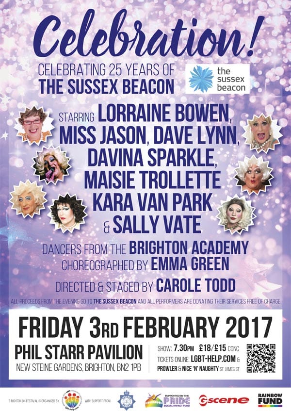 Starring Lorraine Bowen the Crumble Song lady from Britain’s Got Talent, Miss Jason, Alan Jay, Dave Lynn, Davina Sparkle, Sally Vate, Kara Van Park and the legendary drag queen Maisie Trollette, now in the 83rd year of her reign and still performing regularly at venues in London and Brighton. Dancers from The Brighton Academy choreographed by Emma Green will open the show which is directed and staged by West End director and choreographer Carole Todd. Tickets at VIP tables cost £18/£15 conc and can be bought at Prowler, Nice n Naughty and the Sussex Beacon Charity Shop in St James Street. All artists are donating their time and proceeds from all tickets sales will go the Sussex Beacon.