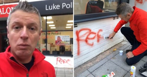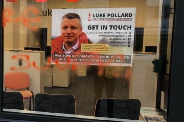 This morning Pollard found his offices in Plymouth city centre office had been attacked and spray-painted with the word ‘pedo’ and other offensive terms. This is the third time that his office has been vandalised.