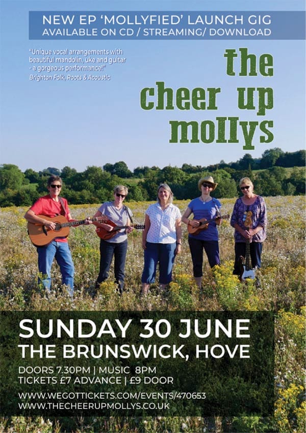 Cheer Up Mollys launch debut EP, Mollyfied, at the Brunswick Pub, Hove on June 30. Known for their feel-good live shows and inventive arrangements of folk, acoustic and Americana music as well as well-known 70s and 80s pop hits, the all-female five-piece have been playing together for three and a ha