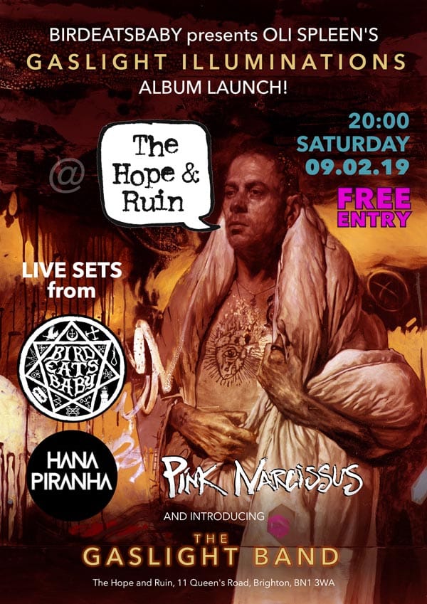 Solo artist Oli Spleen will launch his new album, Gaslight Illuminations, and celebrate his joint birthday with collaborator Mishkin Fitzgerald from Birdeatsbaby, at the Hope & Ruin in Brighton on Saturday, February 9 from 8pm.