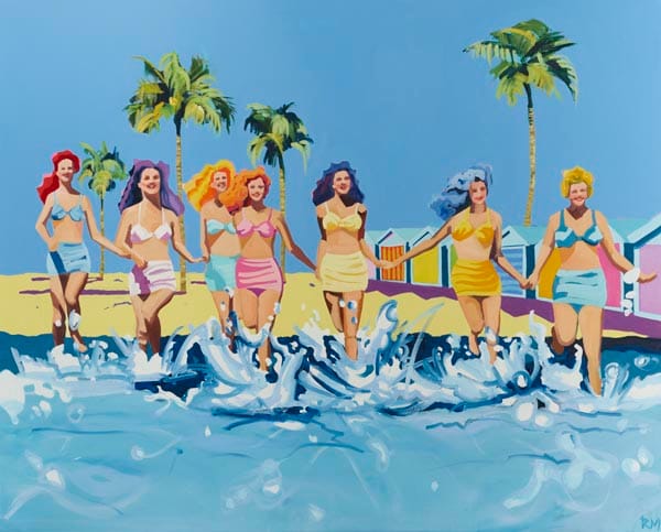 With their vibrant colours, smiling sunbathers and gleeful swimmers, Ruth Mulvie’s paintings are pure joy. Ruth creates her utopian wonderlands from her loft studio in Brighton. Found imagery and old photographs form the basis of her work – with buckets of colour thrown in.