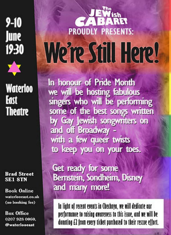 “We’re Still Here!” is a tribute to the Queer songwriters of the Jewish community who have transformed and defined music and theatre over the years. This performance aims to raise funds and awareness in aid of the LGBT+ community in Chechnya, who are currently being persecuted for their identity. T