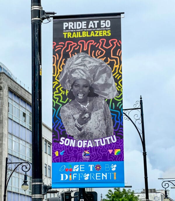 A series of over 50 lampposts can be seen on Queen’s Road and Old Steine, leading partially on the Pride Parade route towards Preston Park. The lampposts feature portraits of some of the incredible trailblazers who began this movement in our city and allowed us to be here celebrating, 50 years on.