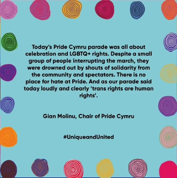 Pride organisers said “There is no place for hate at Pride. And as our parade said today loudly and clearly ‘trans rights are human rights’,” said Gian Molinu, chair of Pride Cymru, in a tweet posted by the organisation on Saturday evening.