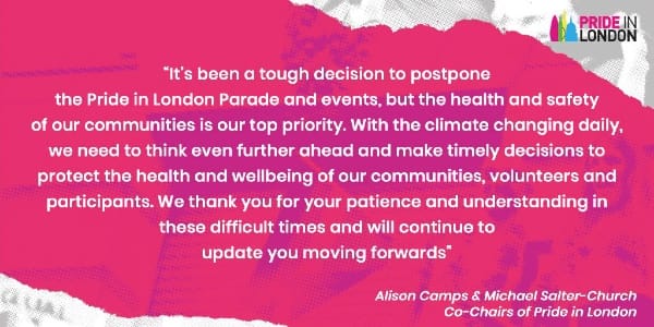 “It’s been a tough decision to postpone the Pride in London Parade and events, but the health and safety of our communities is our top priority. With the climate changing daily, we need to think even further ahead and make timely decisions to protect the health and wellbeing of our communities, volunteers and participants.