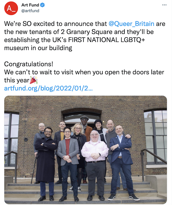 In a Twitter post, ArtFund said: “We’re SO excited to announce that Queer Britain are the new tenants of 2 Granary Square and they’ll be establishing the UK’s first national LGBTQ+ museum in our building. Congratulations!