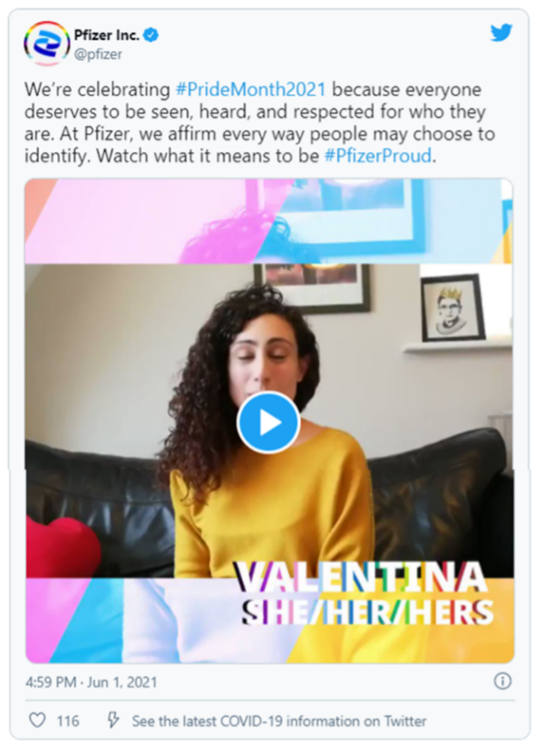 • Moral integration – a brand must have the ability to pursue its moral beliefs in all situations, as failure to do so results in brands being dubbed as ‘opportunists’ and ‘fameseekers’ – manipulating the boundaries of free speech to serve personal interest rather than reform morality. For example, despite sharing the positive experience of its LGBTQ+ staff members, Pfizer demonstrates a lack of moral integration by simultaneously funding anti-gay politicians.