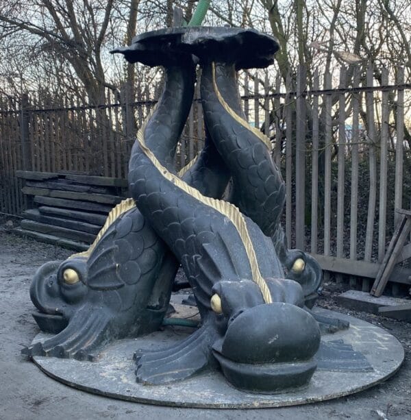 The large, cast-iron dolphins and fountain pool, with its ‘egg-and-dart’ moulding ring, have already been blasted ready for inspection and for welding work to begin.