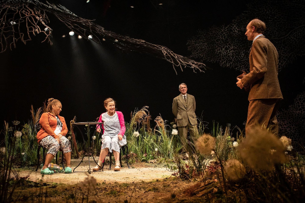 Storey taunts and teases us about where these characters are – huge grounds and 2000 occupants of the buildings – residents, patients, prisoners or people in rehab – it’s never clear. Then when you wonder where this is all going, two women make their appearance, followed by a third mysterious man. Where Jack and Harry are posh or faux posh, Marjorie( Dona Croll) and the limping Kathleen ( Hayley Carmichael) are feisty, coarse, bordering on obscene and speak more truth than they realise. Then there’s the mysterious Alfred ( Leon Annor), who specialises in deep breathing and lifting garden chairs high above his head with one hand.
