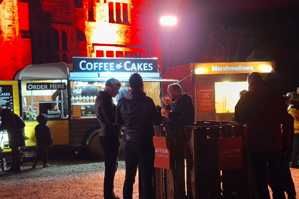 Dress up warm, it’s not a hugely long trail but dawdling along will take an hour. There’s a stop half-way for nibbles and warming treats, waffles, mulled wine, marshmallows with two huge charcoal braziers to warm chilly fingers on.