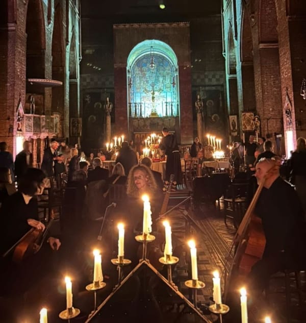 In the middle of the space a dais with a round table is set up like a dining table, this is where most of the ‘action’ takes place. The music is from viol consort Fretwork who are arranged in front of the huge marble alter in St Barts with the singers slowly moving around the space, holding candles, with their voices coming from different directions. We are thus very close to the singers, an utterly magical feeling, right in the middle of these supreme refined polyphonic harmonies, and can clearly hear them all flowing, folding and coming together.