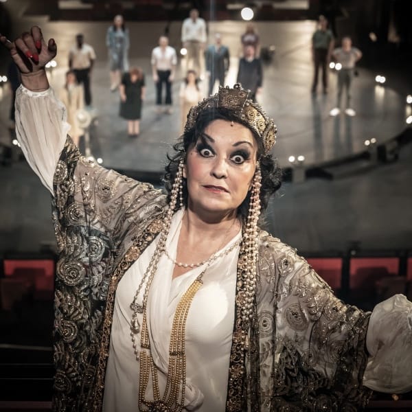 Now she barnstorms her way through the part again in a hybrid film/theatre version streamed from the stage of the Curve Theatre in Leicester.