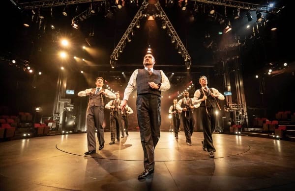 Re-imagined by director Nikolai Foster, the musical seeks to use every inch of the building , onstage, backstage and even in the flies high up in the auditorium . The great-sounding 16 piece orchestra sit socially distanced in the stalls and so do the cast. Scenes are played out to 7 cameras – most of them roaming in and out of the action.