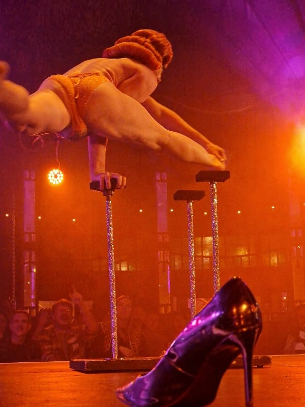 Let’s talk some of the highlights from the entertaining and engaging show! Little Finch, those sassy aerialists, handsome husband due, who whip through the air with stylish, lightning-fast artistry. They close the show with an elegant Gautier-inspired smooching sailor act that’s all quick-fire contortions and in the air drop changes, making the audience gasp at the furious tempo of it, elegant contours, and rope sashay work—simply breathtaking! These are the highest heels in the fringe, darling!