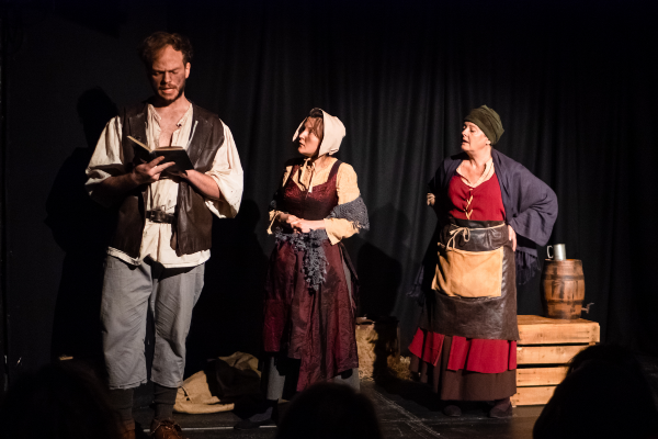 Liam Murray Scott is Matthias, an alchemist who believes he has found a cure. His two female fellow cell mates played by Sorcha Brooks , and Char Brockes are a richly drawn trio . Matthias, confident, intelligent and anti-establishment, Sorcha’s Hannah a worldly wise, thief and crowd-pulling quack doctor; Char’s Jennet a spineless, naive religious follower who turns out to be Hannah’s daughter.