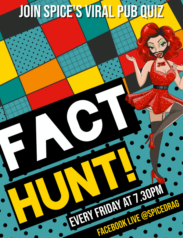 I’ve done quite a few live performances. Living in Lanzarote, we went into lockdown about a week before the UK and when we did it was quick and it was strict. Within a couple of days I decided to get online and try to bring people together, so I came up with my viral pub quiz Fact Hunt. It’s now become a regular Friday evening event and between the planning and execution it fills a couple of my days quite nicely! I also presented Spice Takes the Bins Out. I figured if people were bored enough they’d watch it. And so far about a thousand people have – that’s bonkers!