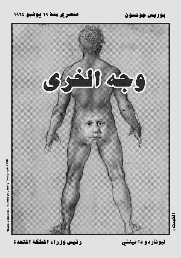 The poster is an enlarged version of Alqumit Alhamad’s controversial Boris x Da Vinci, a digital illustration of the prime minister with the Arabic word AssFace. Alqumit, a gay Syrian artist and refugee, created the work as a response to Johnson calling gay people ‘bum boys’ as well as his calling Hijab-wearing women ‘letterboxes’.
