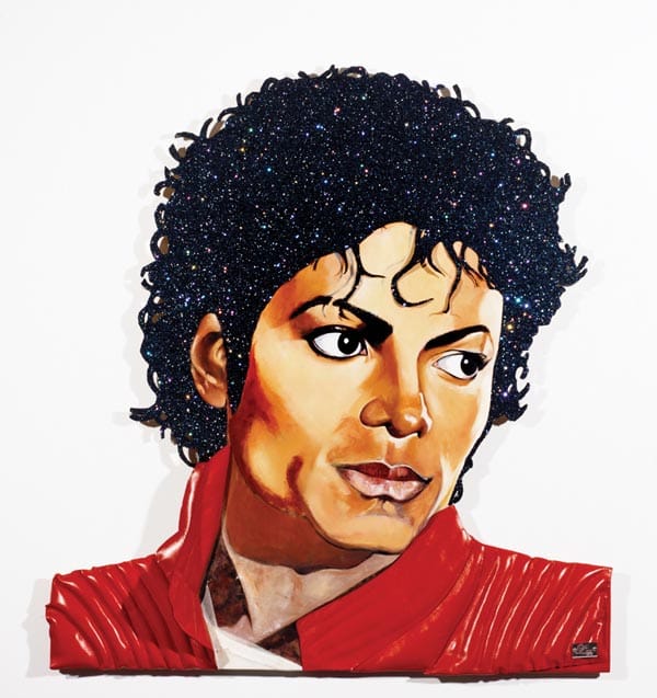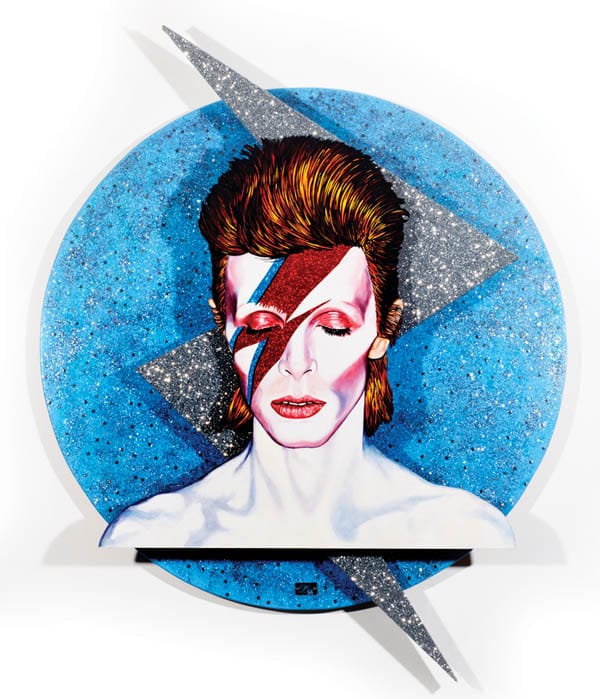 Glass refilled as it is many times that evening, my bottom barely brushes the cushions of the sofa before she’s back from the kitchen and we’re off for a tour of the art. “Come to the bedroom and meet David!” she hurries, which does nothing to settle my heart-rate. David, it turns out is a painting and I am not at all disappointed to find a three dimensional Pop-Art inspired painting of David Bowie looming at me from above the bed, its colours and silver gleaming base as vibrant and arresting as its creator. The Bowie piece is one feature of a series of paintings appropriately named Icons, and as she talks of each work and its inspired name-sake, I am struck at how she speaks of the completed works and their inspirations as though long-standing friends, Michael Jackson, Grace Jones, Annie Lennox, Freddie Mercury and Elvis amongst the newly arrived dinner guests. I had spotted ‘Grace’ the moment I had stepped into the flat and took great delight in what I perceived to be a potential ice-breaker.