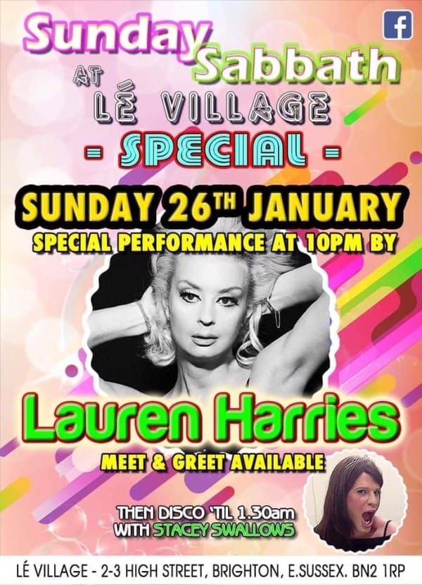She’s back! The delightful Lauren Harries will be returning to Le Village, Brighton on Sunday, January 26 from 9.30pm.