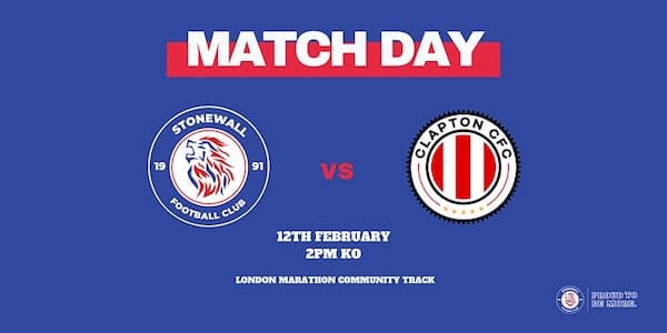 Stonewall FC’s first team is to go up against friends, allies and league rivals Clapton Community Football Club in what will be their first ever meeting at the London Marathon Community Track on Saturday, February 12 with kick off at 2pm.
