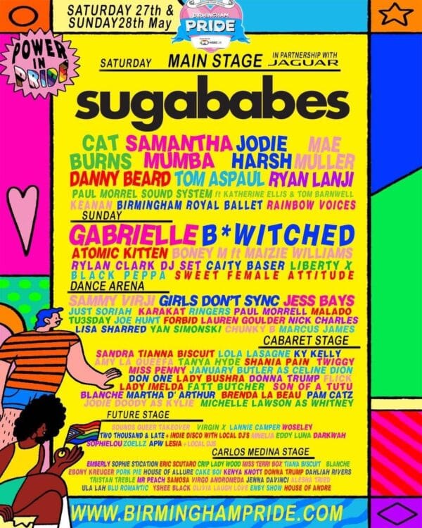 Sugababes will headline the event’s main stage – in partnership with Jaguar – in 2023 alongside: Brit nominated Cat Burns; singer Samantha Mumba; drag queen DJ Jodie Harsh, this year’s Eurovision contestant for the UK, Mae Muller; winner of RuPaul’s Drag Race UK season 4 winner, Danny Beard; Tom Aspaul; Ryan Lanji; Big Proud Party Agency judge, Paul Morrell; Sound System (ft. Katherine Ellis & Tom Barnwell); Rugby player and contestant on Love Island season 9, Keanan; Birmingham Royal Ballet; and Rainbow Voices.