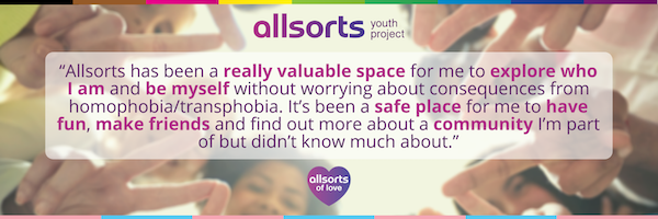 To find out more about Allsorts Youth Project’s specialist LGBTQ+ youth services CLICK HERE, or to support their work with a monthly donation CLICK HERE