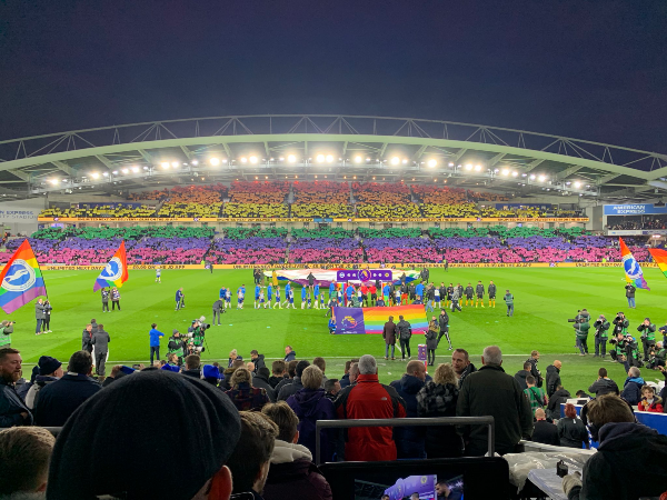 Brighton and Hove Albion (BHAFC) have increasingly embraced the LGBTQ communities in our city over many years and more recently publicly challenged homophobia. The stadium at Falmer often referred to as the Amex, is actually called The American Express COMMUNITY Stadium and BHAFC put the community of Brighton and Hove at the heart of what they do. The club celebrated Stonewall’s Rainbow Laces Campaign and made a clear statement in its support of not only the campaign, but the LGBTQ community, which is as synonymous with Brighton and Hove as the club itself. The stadium is regularly awash with LGBTQ rainbow flags and its match day programmes feature interviews with management, staff and players, outlining the importance of the diversity and inclusion initiatives including celebrating the LGBTQ communities.