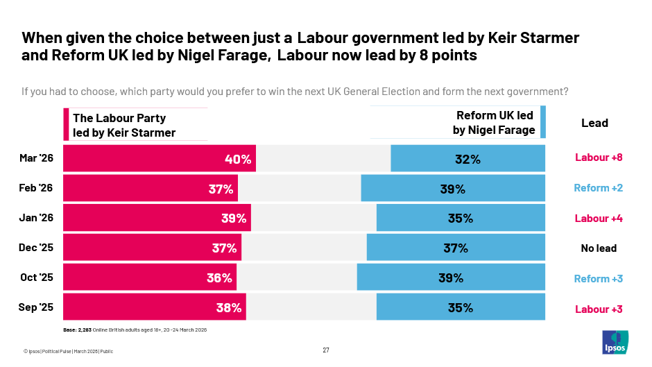 New data published this week by Ipsos makes for instructive reading. When presented with a binary choice, the British public would prefer a Labour government under Starmer to a Reform UK government under Farage by 40% to 32%, an 8-point lead that is up from a 2-point lead for Farage in February.