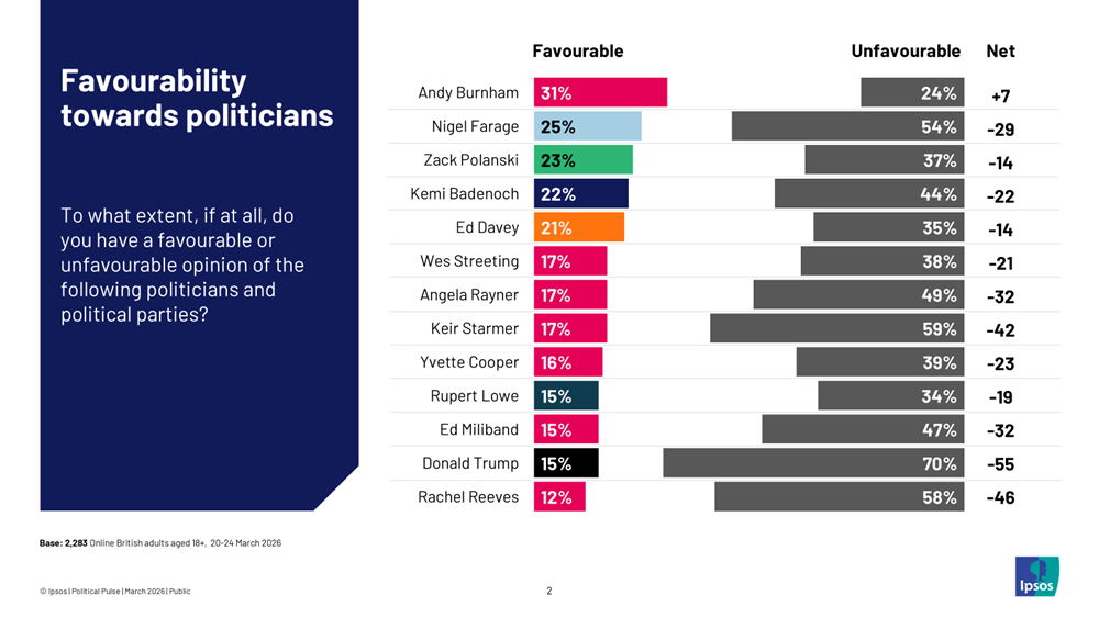Despite preferring Labour when forced to choose, the public are more likely to expect Reform to win a majority or be the largest party at the next election (28%) than Labour (19%). Andy Burnham remains the only politician on the Ipsos list with a net positive favourability rating.