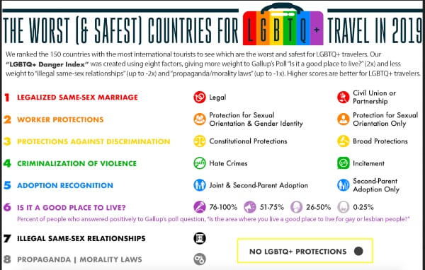 You can see their full findings here: The Worst (& Safest) Countries For LGBTQ+ Travel in 2019