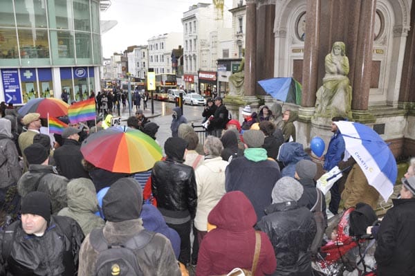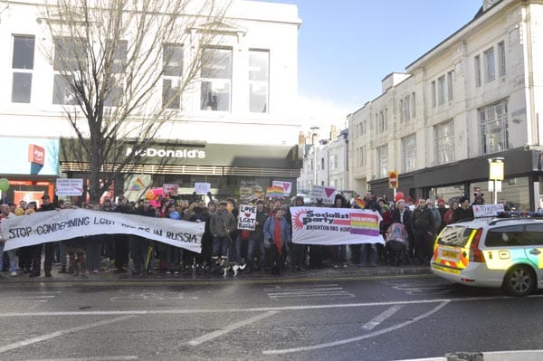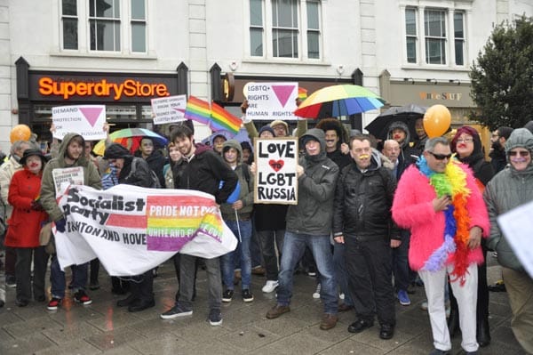 The demonstration was organised by the Brighton and Hove Socialist Party to raise awareness of the increasing violence and oppression faced by gay, lesbian, bi, trans, queer and other people in Russia.