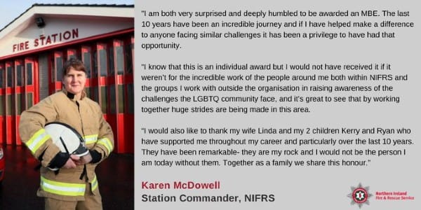 Michael Graham, Northern Ireland’s chief fire & rescue officer, congratulated McDowell in a statement: “Karen is a strong, empathetic and admired role model in NIFRS and I would like to congratulate her on this distinguished and well deserved honour…she has brought great insight to the fire service family both locally and nationally in enhancing diversity and equality. She has been instrumental in helping us to build an inclusive and diverse organisation.”