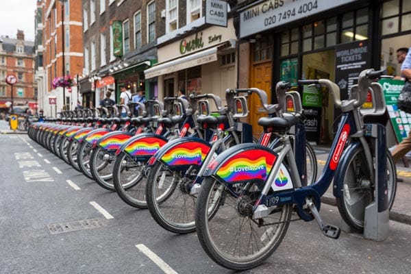 Anyone hiring a Santander Cycle has the chance to ride on one of the fifty cycles that have been decorated with rainbow livery on their rear mudguards, demonstrating and celebrating how proud the capital is of its diversity.