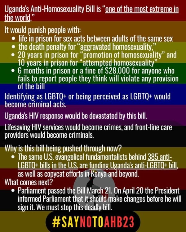 They were protesting in solidarity with Ugandan LGBTs against Uganda’s Anti-Homosexuality Bill, which includes long jail time and even execution for LGBTQ+ people and supporters.